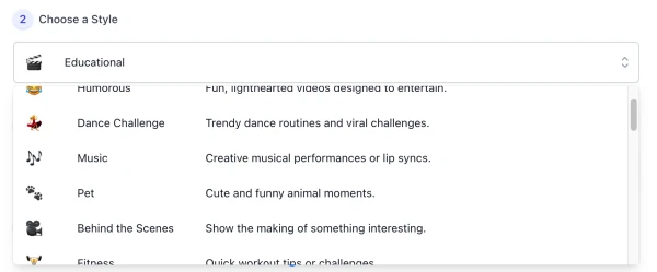 Select one narrative style (e.g., Educational, Storytime, Mistakes & Fixes). The style defines how your 60-second Short will be structured.